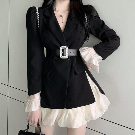 Puff Sleeve Fake Two Piece Irregular Pleated Suit Dress