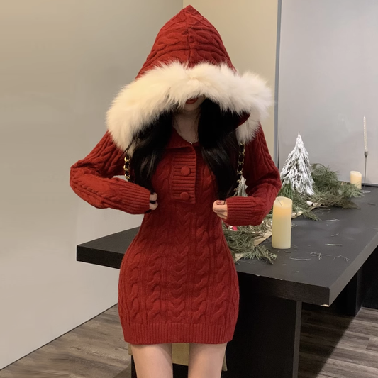 Furry Hooded Christmas Red Knitted Dress
