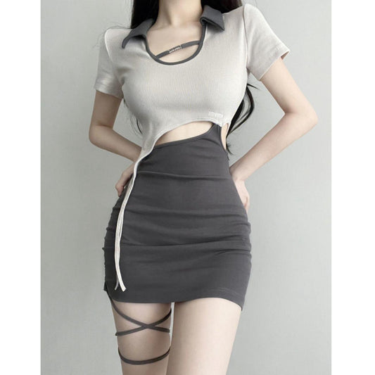 Contrasting V-Neck Bodycon Lapel Short Sleeve Dress