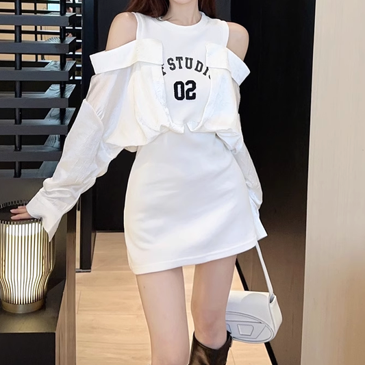 Off-The-Shoulder Paneled Fake Two-Piece Slim Dress