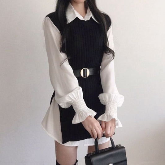 Flared Sleeve Shirt Belt Knitted Vest Winter Dress Set