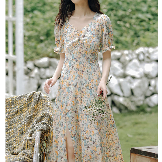 Waisted Short-Sleeved Chiffon V-Neck Floral Dress