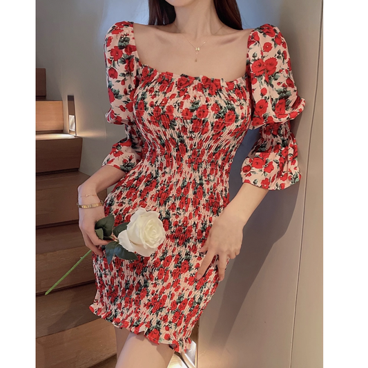 Square Neck Bubble Sleeve Bodycon Floral Dress