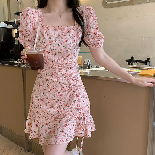 Puff Sleeve Waist Neck Square Neck Floral Dress