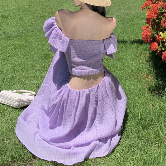 Exposed Waist V-Neck Seaside Holiday Purple Dress