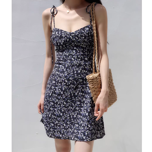 Lace-Up Waist Blue Floral A-Line Cami Dress