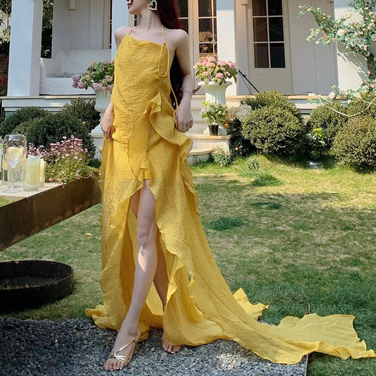 Halter Neck Flowing Chiffon Backless Holiday Dress