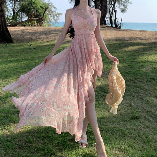 Pink Floral Halter Neck Halter Backless Holiday Dress