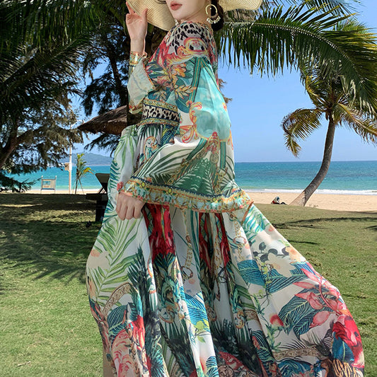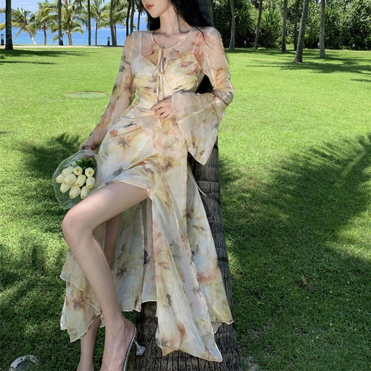 French Chiffon Floral Long-Sleeved Holiday Dress