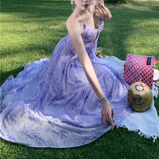 Sexy High Waist Backless Mesh Floral Suspender Dress