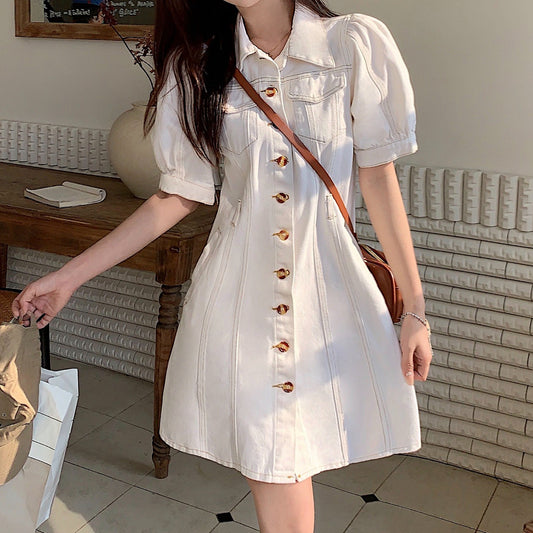 Single-Breasted Lapel Puff-Sleeve Denim Dress