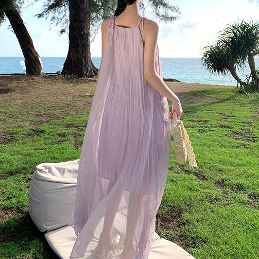Pleated Petal Feather Seaside Holiday Purple Dress