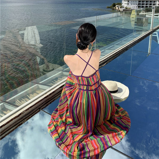 Rainbow Striped V-Neck Suspender Sexy Backless Waist-Cinching Holiday Dress