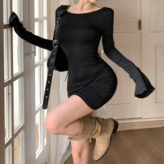 Backless Lace-Up Long-Sleeve Slim Fit Black Dress