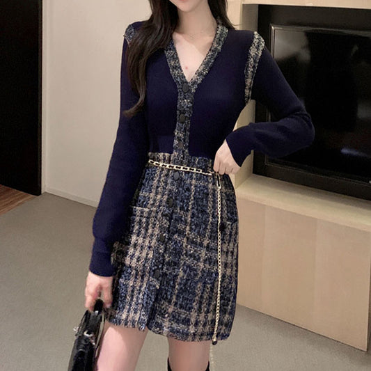 Belt-buttoned V-neck elastic houndstooth knitted dress