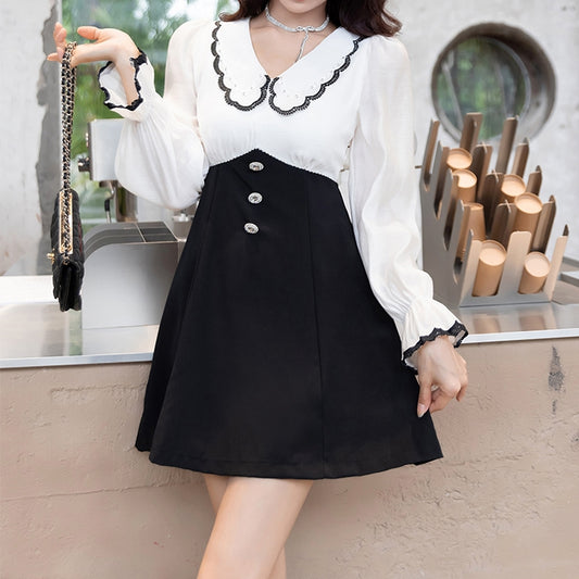 Lace Edge Doll Collar Color-Blocked Long-Sleeved Dress