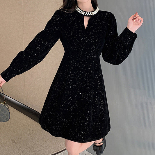 AlennusmyyntiHollow Pearl Stand Collar Black Velvet Dress