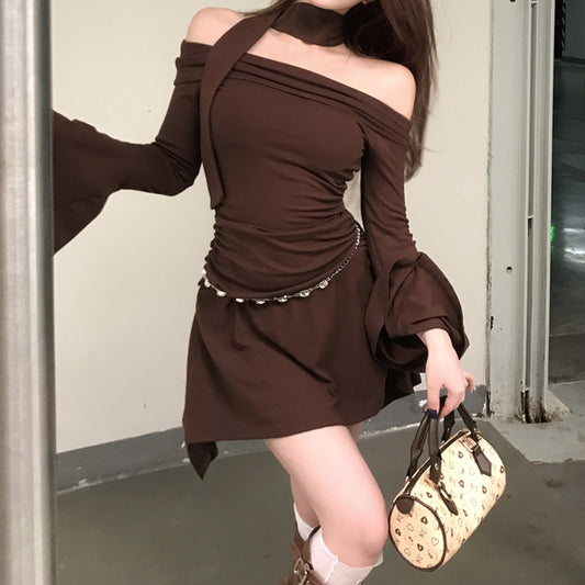 AlennusmyyntiOff-Shoulder Trumpet Sleeve Solid Color Hip Dress