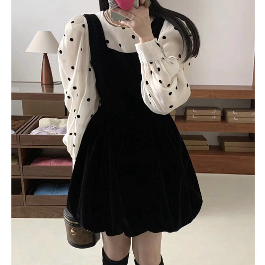 Bow-Back Velvet Dress Polka-Dot Shirt