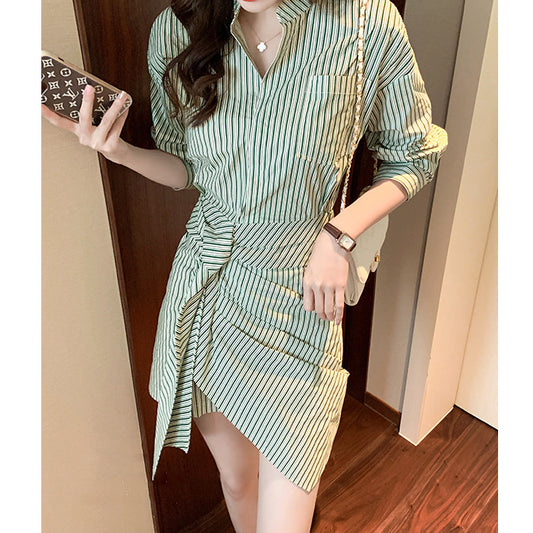Irregular Striped Waisted Long Sleeve Shirt Dress