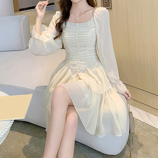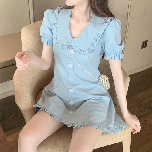 Doll Collar Ruffled Puff Sleeve Waist A-Line Dress
