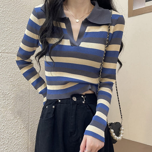 In offertaStriped Lapel Long Sleeve T-Shirt Knit Top