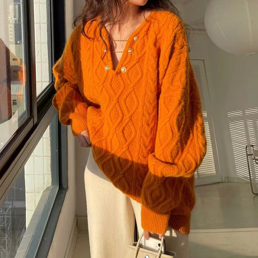 Twist V-Neck Loose Long-Sleeve Knitted Sweater