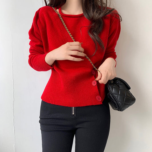Waist-In Fake Two-Piece Three-Button Knit Sweater
