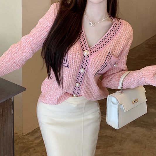 Temperament Tweed Neck Long-Sleeved Cardigan Knitted Top