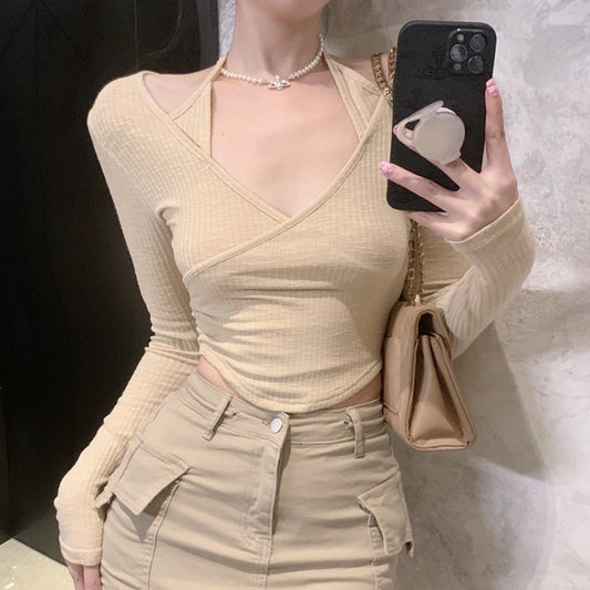 Halter Neck V-Neck Long-Sleeved Knitted Crop Top