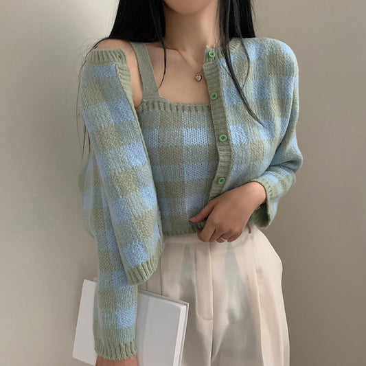 Plaid Sweater Cardigan Set Knit Cami Cropped Coat