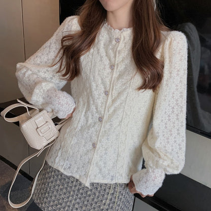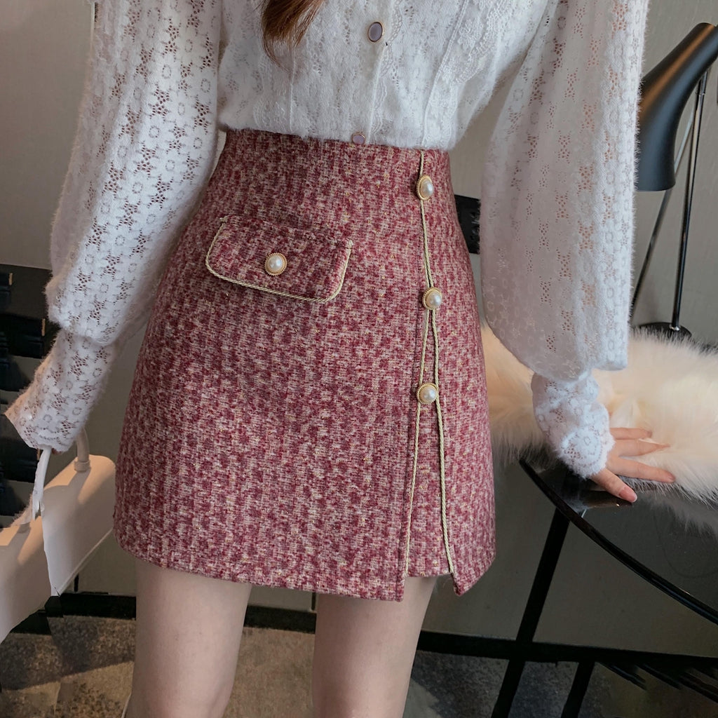 Lace Shirt Woolen Plaid Skirt Set