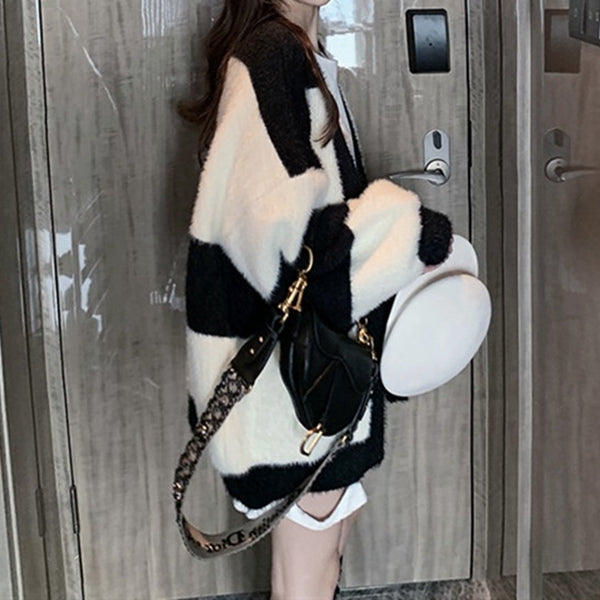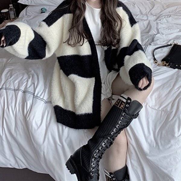 Long Sleeve Striped Colorblock Knit Sweater Cardigan Winter Clothes