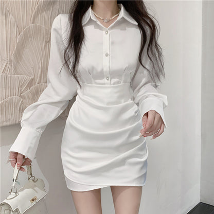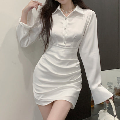 Satin Lapel Button Long Sleeve White Shirt Dress