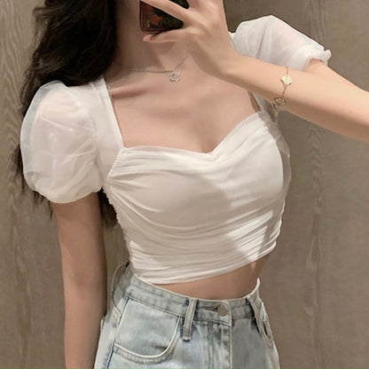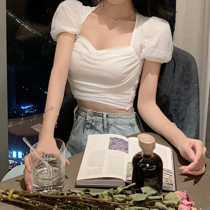 White Square Neck T-Shirt Puff Sleeve Crop Top