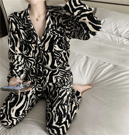 Velvet Sexy Zebra Print Cardigan Long Sleeve Lounge Wear Two Piece Set
