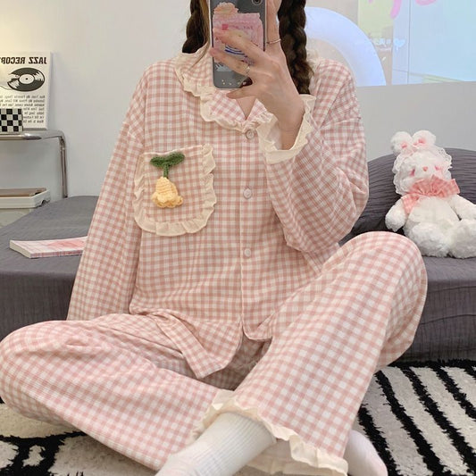 Floral Plaid Ruffle Collar Casual Home Pajamas Set