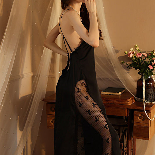 Sexy Backless Deep V Lace Satin See-Through Suspender Nightdress