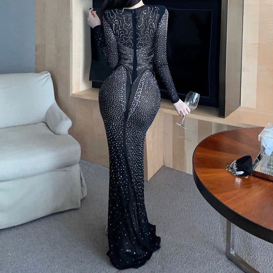 Mesh Hot Diamond Long-Sleeved Slit Party Dress