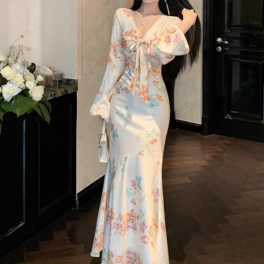 Satin Backless V-Neck Floral Elegant Fishtail Dress