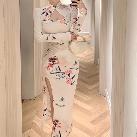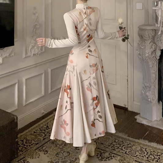 Flower Cheongsam High Waist Slim Long Sleeve Dress