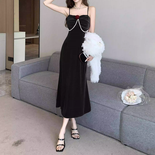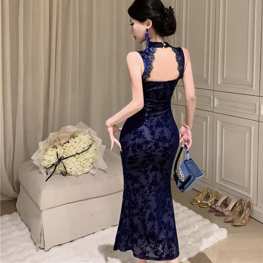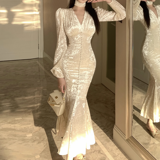 Velvet V-Neck High Waist Slim Fishtail Long Dress