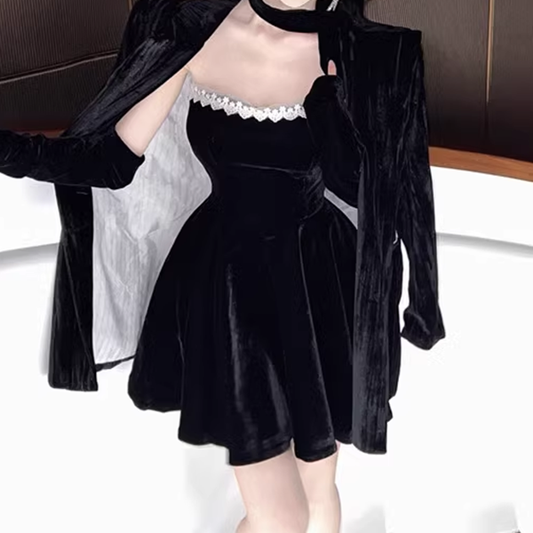 Black Gloves Halter Neck Velvet Split Backless Cocktail Dress