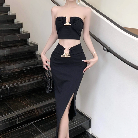 Clavicle-Exposed Tube Top Vest Cape Slit Slim Skirt Set