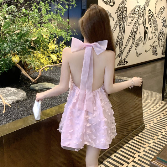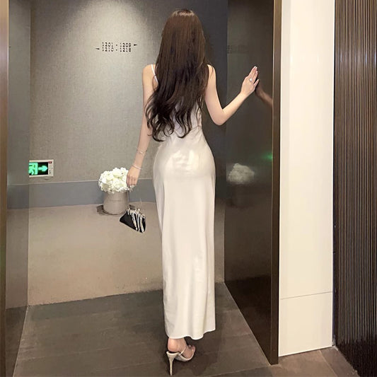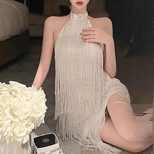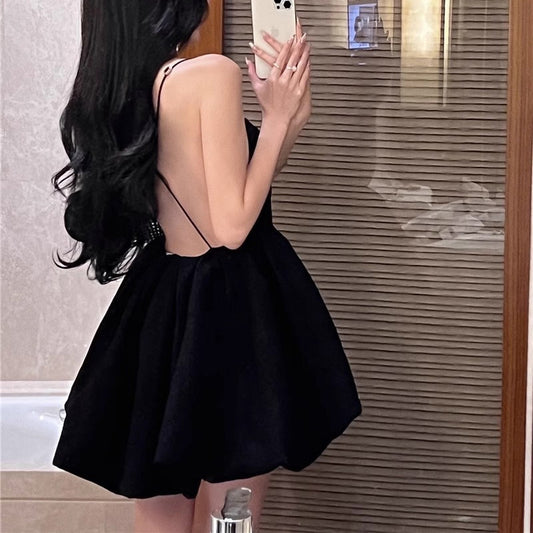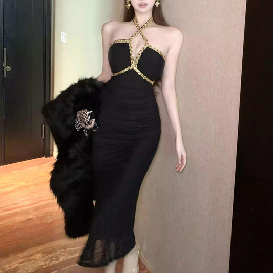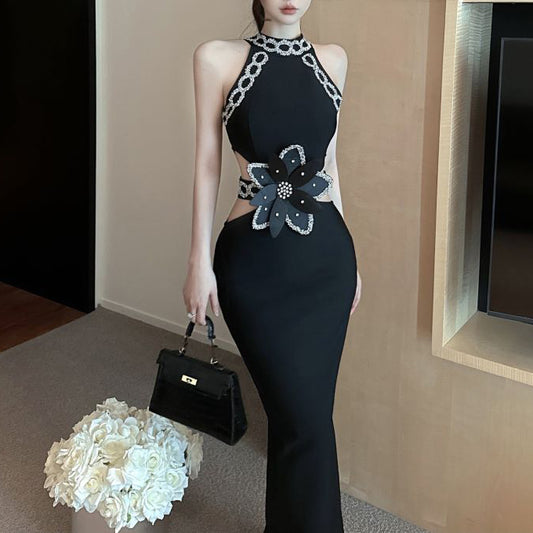 French Sexy Exposed Nail Beads Hollow Halter Neck Dress