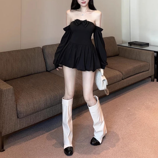 Off-Shoulder Lantern Sleeve Pleated Flower Cake Dress