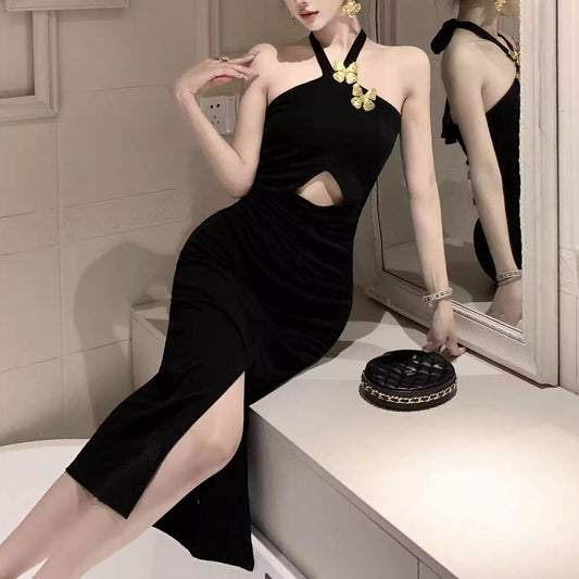 Halter Neck High Waist Slim Fit Slit Hollow Dress