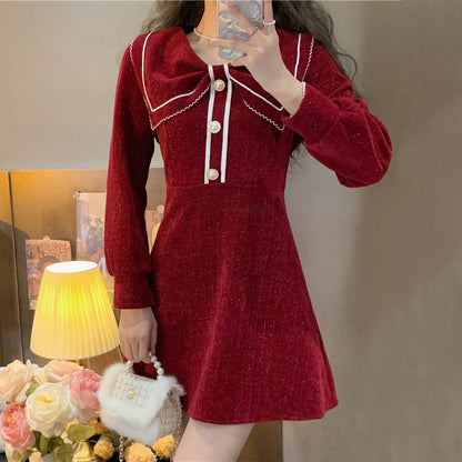 Bow Neck Long Sleeve Button Dress