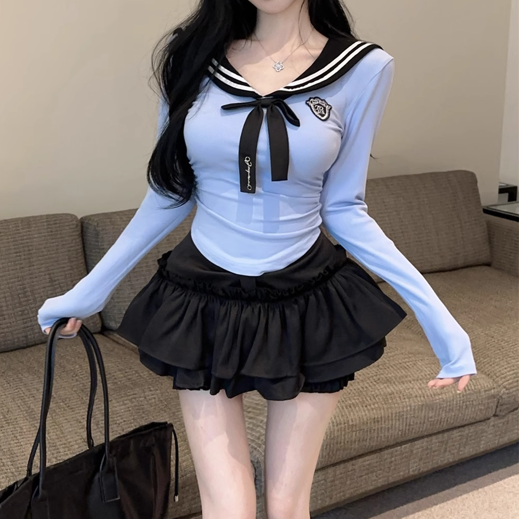 Bow Tie Navy Collar Slim Fit Top Cake Skirt Set