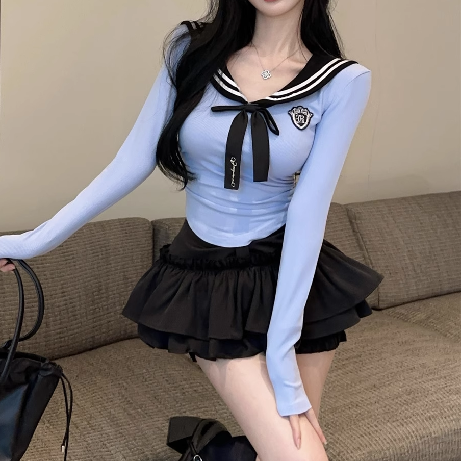 Color: Blue Top + Tie + Black Skirt, Blue Top + Tie (No Skirt), Black Skirt (No Top + Tie)